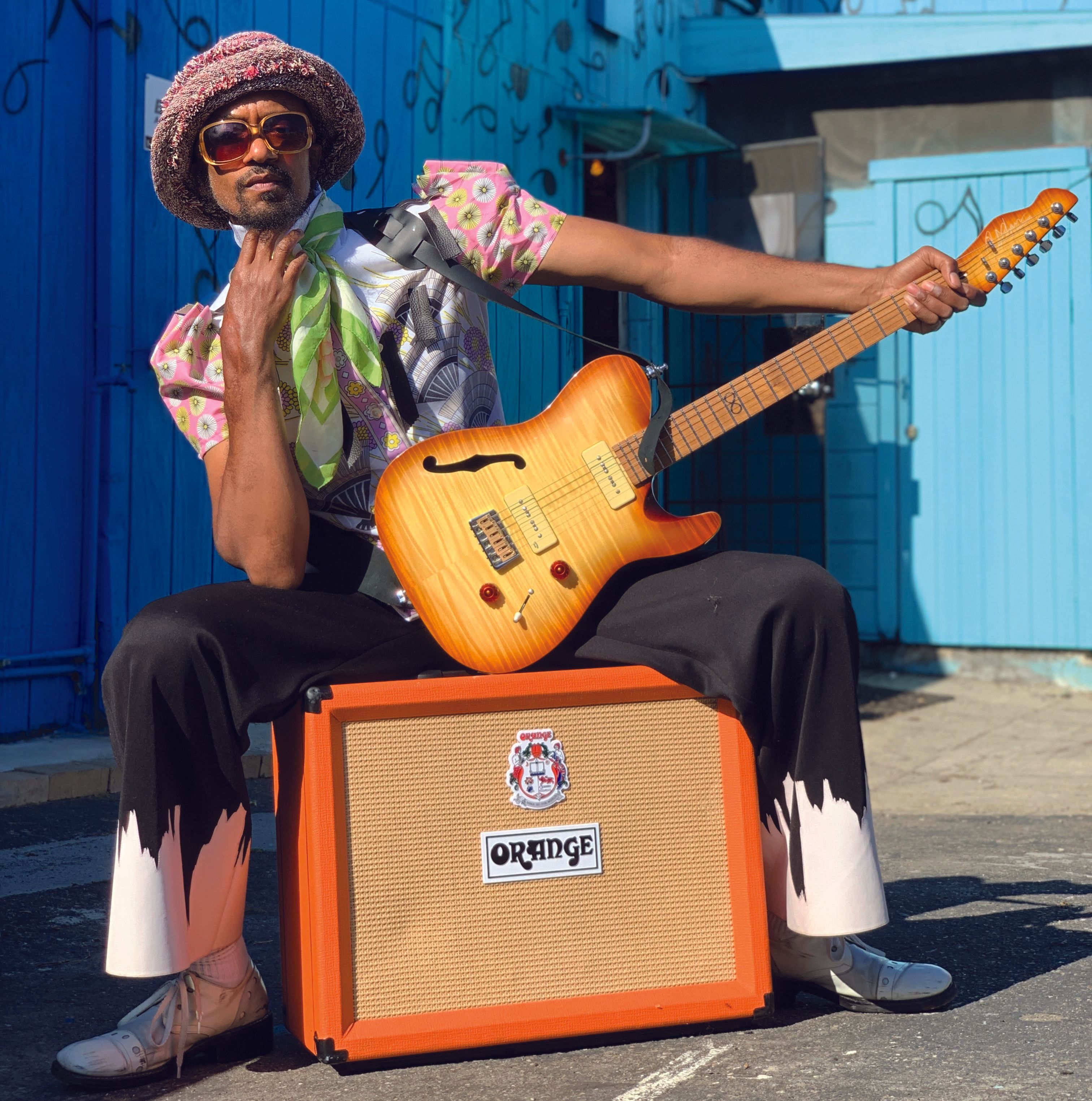Fantastic Negrito atop his preferred amplifier, an Orange TremLord 30, with a P-90-stocked Chapman T-style.