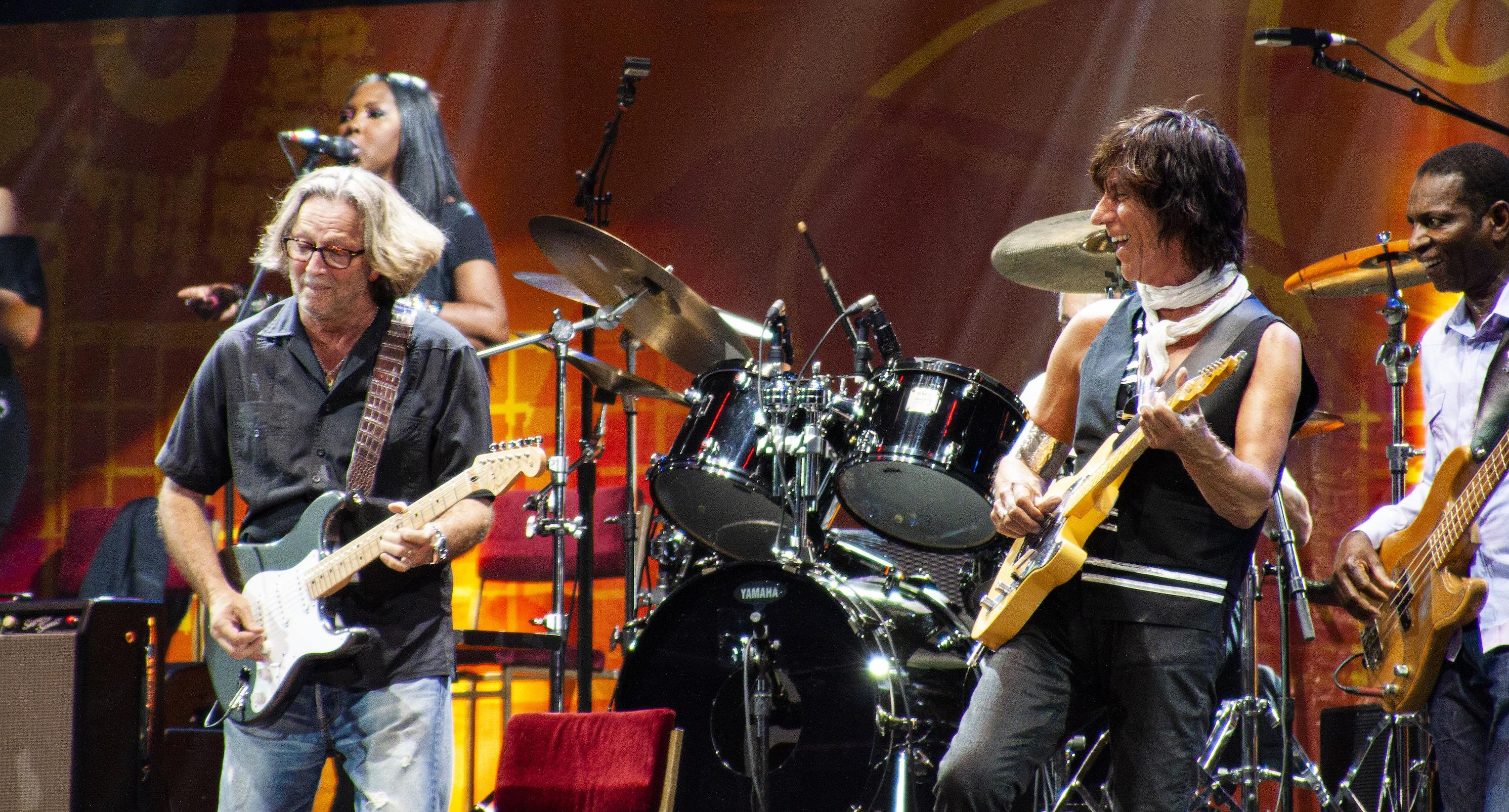 Longtime friends Jeff Beck and Eric Clapton share the stage at the 2010 Crossroads Guitar Festival.