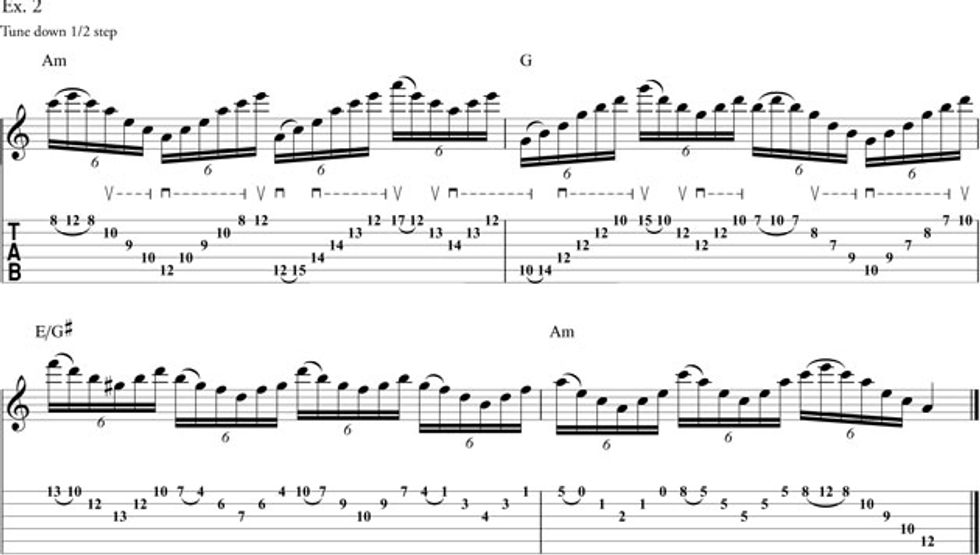 “The first figure is a standard 5-string A minor sweep shape,” explains Stump. “I added the hammer-on and pull-off to make it an even sextuplet.” The second half of the lick focuses on smaller, more manageable 3-string shapes that hop up and down the neck. “I’ll frequently mix and match arpeggio and sweep shapes that are all the same note value,” he explains.