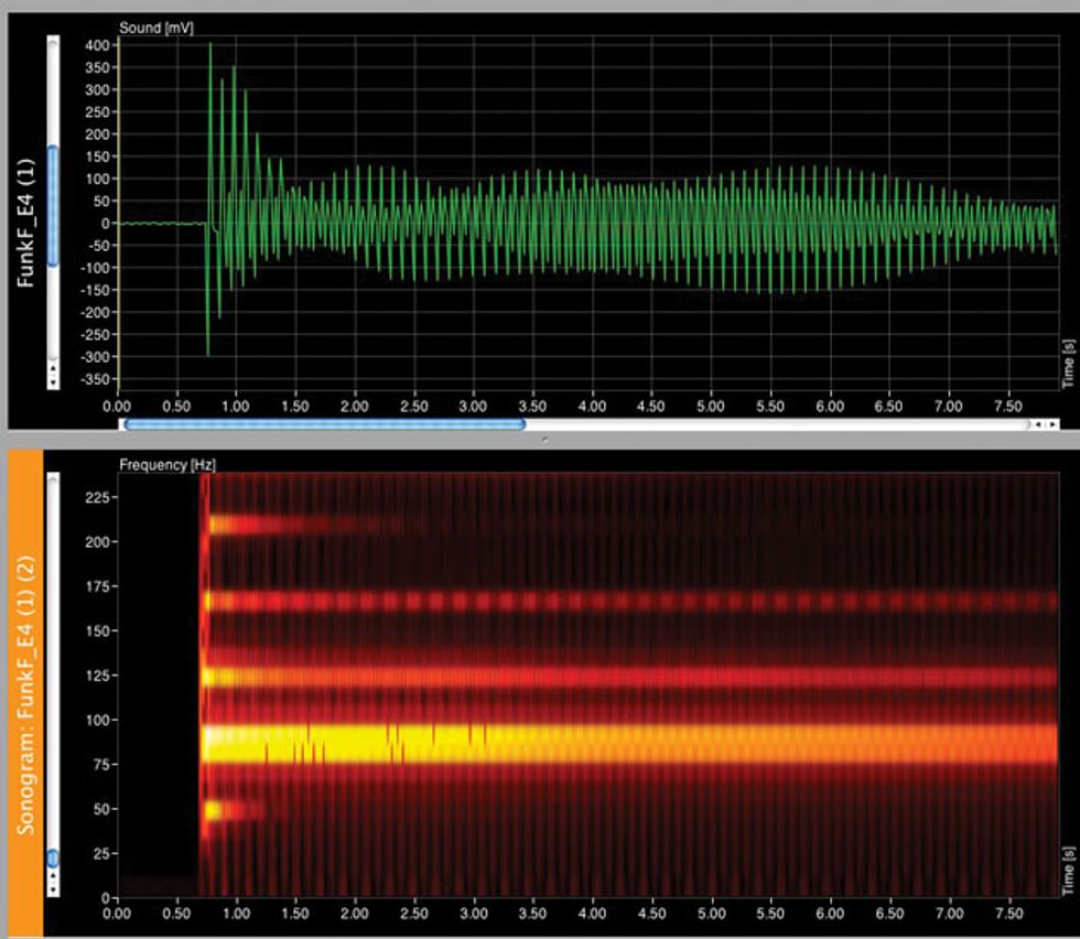 The sample note used for the spectrum and sonogram in Photo 3 is an open E with its fundamental at 41.2 Hz. Remember, the fundamental has its greatest amplitude in the middle of the string around the 12th fret (and nodal points at the bridge and nut). This is close to the end of the fretboard, and also close to the point where the string hits the fretboard when played with Funk Fingers. That means we can’t expect much of the fundamental to make it into the sustaining portion of the note—we’ll see more of the first harmonic, with its nodal point in the middle of the string. Depending on the fretboard’s length, there may even be a high ratio of the second harmonic in the remaining spectrum, and that’s exactly what we see in the sonogram: a powerful, but rapidly dying fundamental with prominent 1st and 2nd harmonic that eventually take over in the sustaining note. The initial attack and increased upper harmonics are the main reasons why Funk Fingers cut through in a band mix.