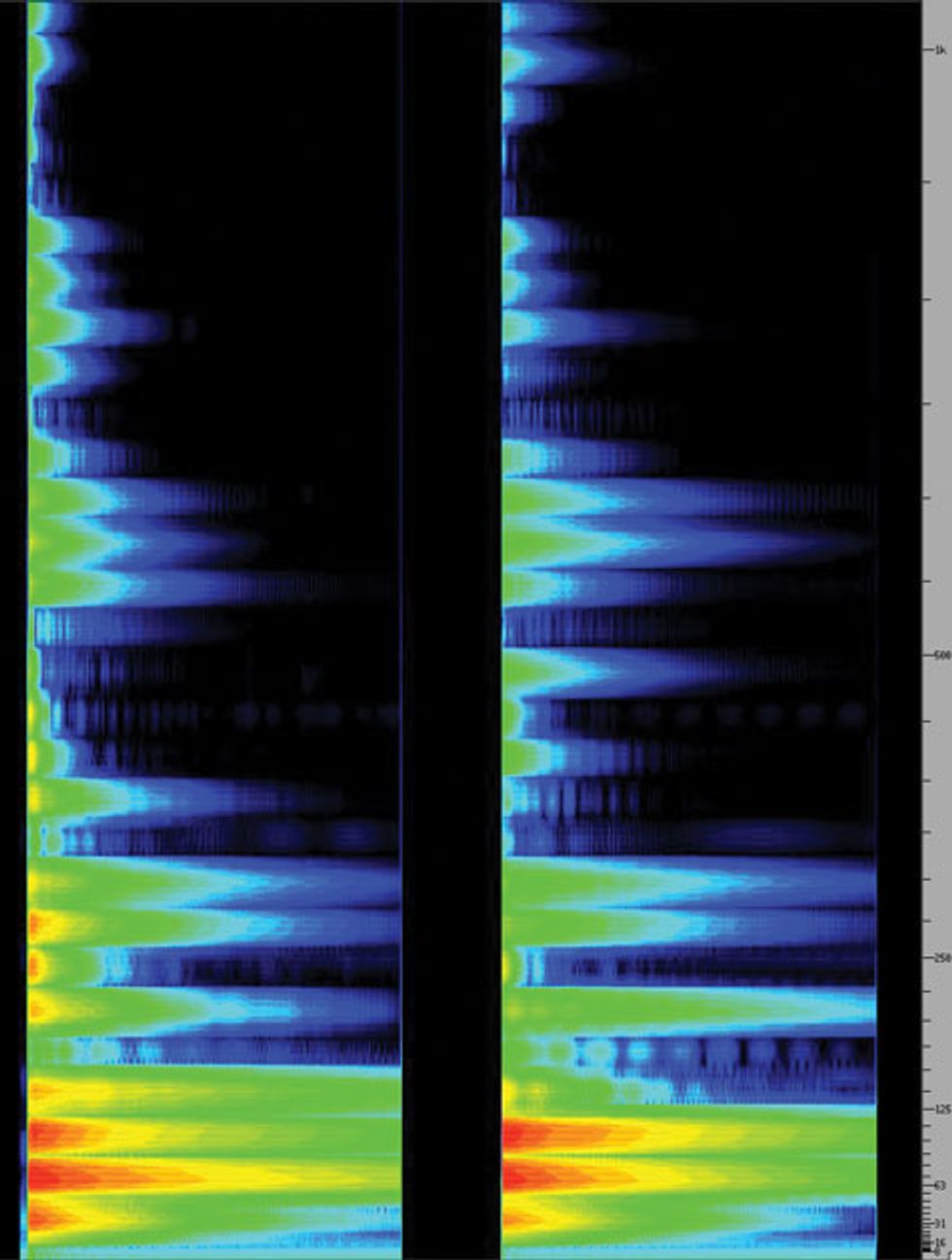 The complex ways that a sustaining tone evolves over time has been subjected to much scientific analysis. Image 2 shows two Fourier-analyzed spectrographs of a single note played on two different instruments. The X-axis represents time, the Y-axis represents frequency, and the color represents the amplitude with red being the highest. Frankly, there is a lot of information in the graphic—perhaps too much.