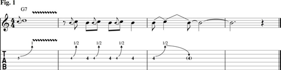 The phrase shown in Fig. 4 is yet another demonstration of Beck’s genius. He takes a basic G minor pentatonic scale and adds in some cool bends to create this original sound. When we hear a lick like this played by someone else we refer to it as a “Beck” lick because prior to him we’d never heard anything like it. This one is also tricky due to the bends on the lower strings that take some hand strength. Like all licks, try this one in different registers on the neck. Also, take the idea of the lick and move it to different scales. In my next installment on Mr. Beck, we’ll take this concept further, just like he did.
