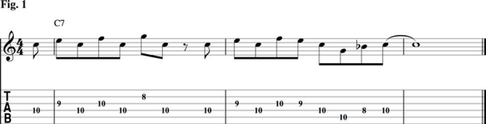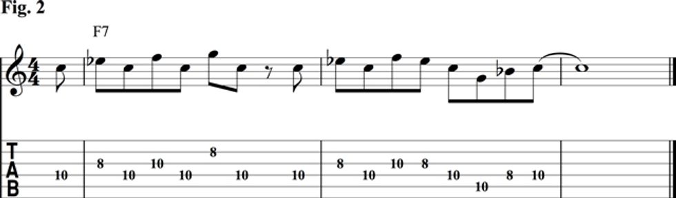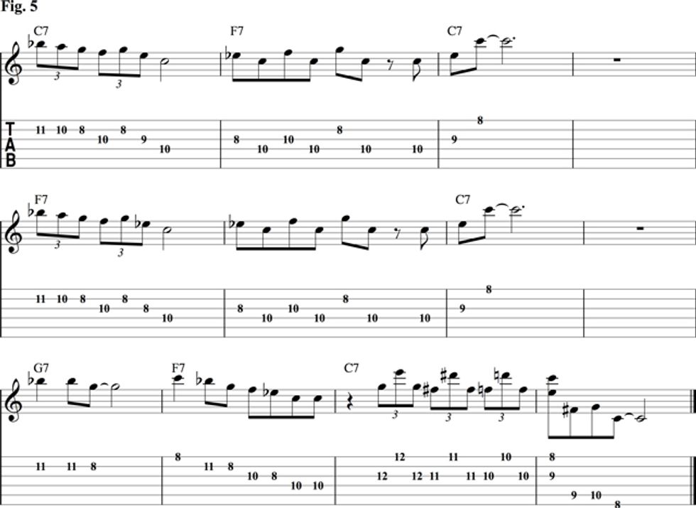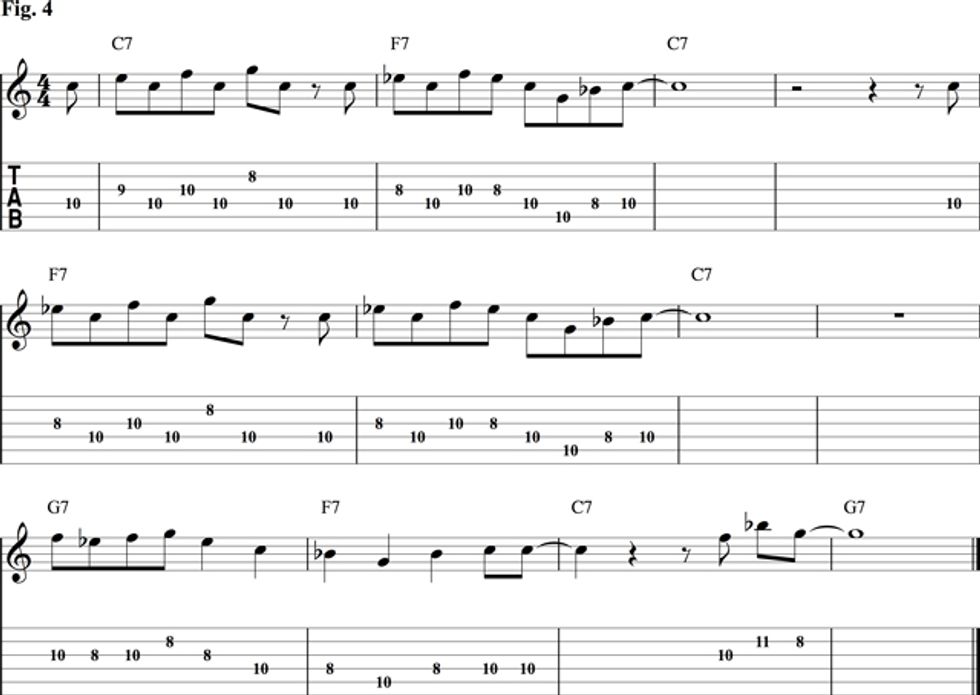 Here’s another tip: Many times blues progressions will feature a “quick change,” meaning the second measure will go to the IV chord, as you can see in Fig. 4.
