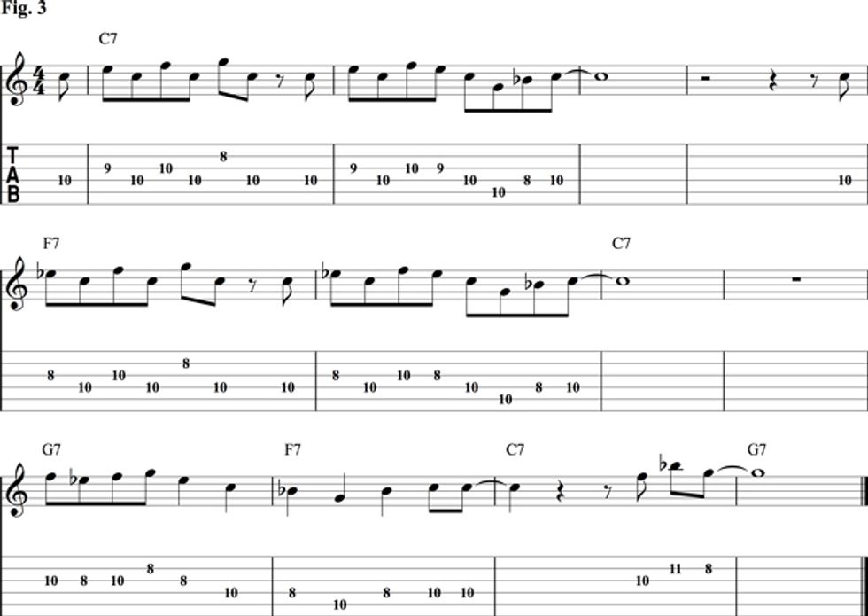 We then apply this technique to an entire chorus in Fig. 3. For now, don’t worry about making the idea fit perfectly for the last four bars. Just finish the chorus with something simple from the blues scale that accommodates all the chords well.