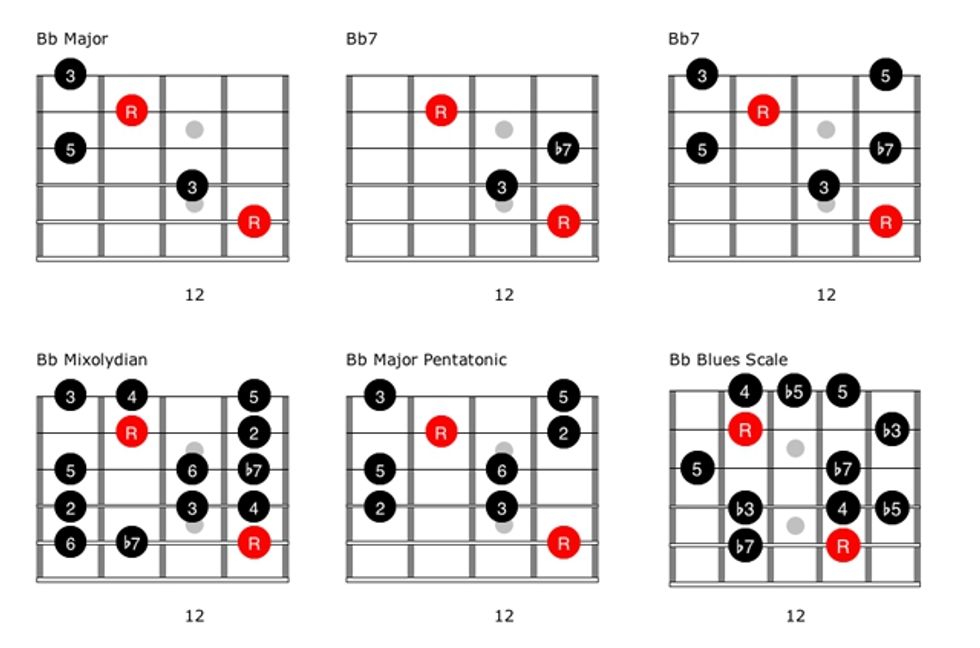 Once you’re comfortable finding this 7th chord in any key, the next step would be to work on the Mixolydian, major pentatonic, and minor/blues pentatonic scale in that position.