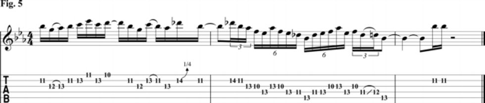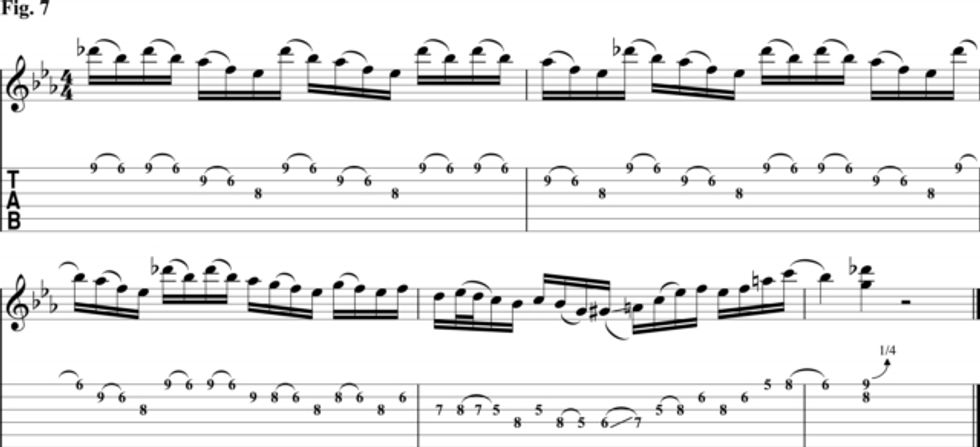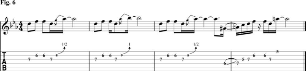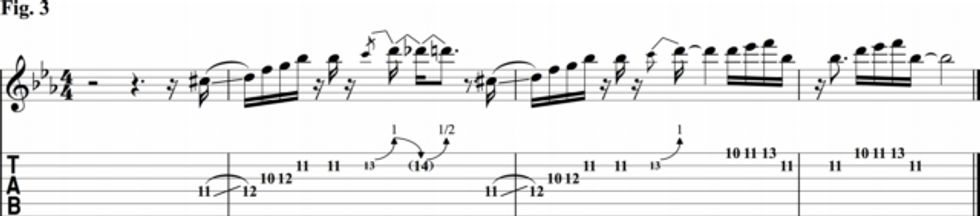 Our first musical example in Fig. 3 uses the Bb major pentatonic scale (Bb–C–D–F–G). Starting out by approaching the major third from a half-step below, we move up the scale, and then bend from the 9 up to the 3. This is one of my favorite features of this position and is an idea I go to all the time. The idea repeats before finishing with another simple repeating motif that ends on the root.