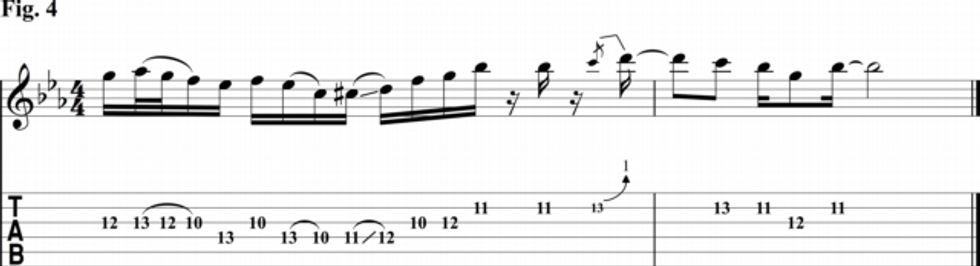 The next lick in Fig. 4 is short and sweet, moving around the middle strings with a bop-inspired pattern (note the chromatic approach to the D). Again, when ascending through the shape, I’ve used the same major pentatonic motif—this just feels right here—though the line ends with a different idea showing you just how easy it is to take one simple idea and turn it into a handful of new phrases.