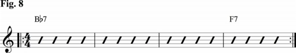 The last lick (Fig. 7) is a John Scofield-style idea using rhythmic displacement, you’ll also notice that to navigate the F7, I play the same motif we played earlier but transposed to F. Ideas like this should flow feely over the backing track with practice, so stick at it until you can freely switch in your mind into this new shape. For the backing track (Fig. 8), I’ve extended how long you would stay on the I chord—just so you can settle in musically.