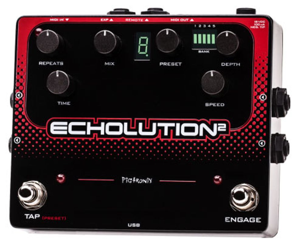 "The release of this pedal marks the 10-year anniversary of Pigtronix." says company president David Koltai. "Echolution 2 incorporates everything we have learned from a decade of effects design and customer feedback to create a uniquely powerful sound design tool."