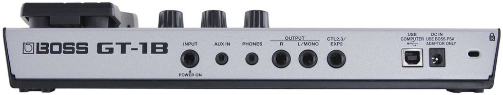 Residing inside the relatively small (12" x 6" x 2 1/4") GT-1B are amp-modeling options, compressor/limiters, a bevy of effects and patches (both preset and user generated), a tuner, and looping capabilities. One can send an MP3 device through the aux in and plug in a pair of headphones for isolated listening capabilities. It boasts a wah/expression pedal and also serves as an audio interface for your preferred DAW—and that’s still not all. In fact, the only component seemingly missing from the GT-1B is a coffee maker, but I refrained from holding that against it. The GT-1B is powered by either four AA batteries or an AC adaptor (not included).