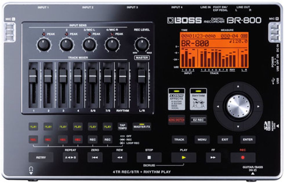 Los Angeles, CA (March 24, 2010) — BOSS continues its top-selling tradition of portable, affordable multi-trackers with the new BR-800—a battery-powered studio to go. The sleek new design is made possible by touch-sensor switches and SD-card recording media. Up to four tracks can be recorded or eight tracks played back simultaneously, plus an additional stereo track dedicated to the built-in rhythm generator.