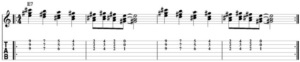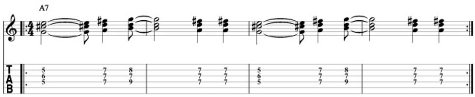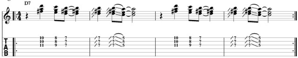 The first example is an A7 rhythmic idea based off of the main riffs of tunes like Miles Davis’ “All Blues,” and The James Gang’s “Funk 49.” A7 is the fifth chord of D Major. In Example 1, I use the triads built off the 7th (C#) 1st (D) and 2nd (E) scale degrees of the D major scale.