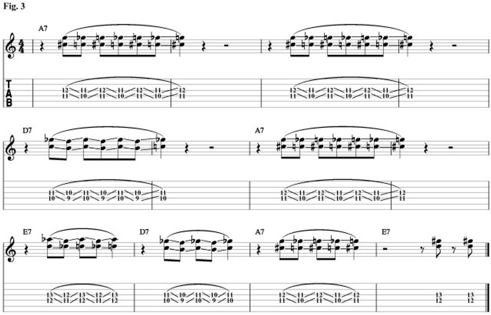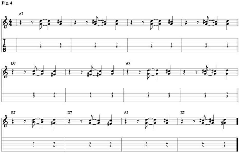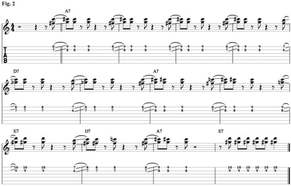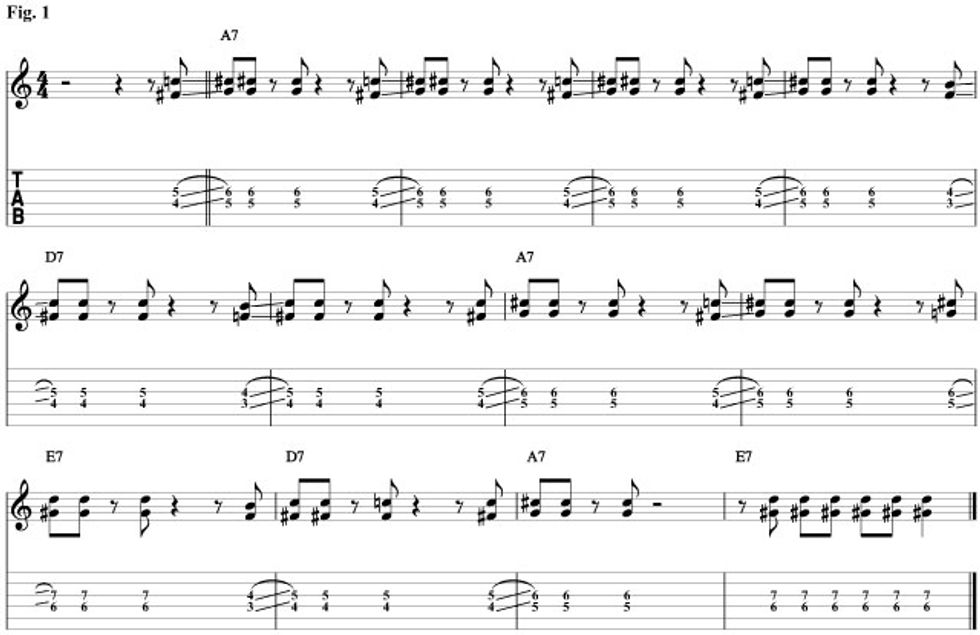 Fig. 1 is based on the piano part in “Cross Cut Saw.” The idea is, as I said before, the 3rds and 7ths of each of the three chords being played in a rhythmic style. But the cool thing is how you can slide these target tones up and down the fretboard to create tension. The funny thing is that the distance between these two notes creates a tritone, probably the most tension filled interval available. So moving them up and down to create even more tension is really fun. This gives an improvisational aspect to your rhythm playing that you don’t get when your only playing full bar chords. We’ll start out with the I chord. The 3rd of A7 is C# and the 7th is G. When we move to the IV chord (D7) the 3rd is F# and the 7th is C. If we look close we’ll see that F# is a half step below G, and C is a half step below C#. So all we’ll do is move our I chord rhythm down a half step when we move to the IV chord in measure five. For the V chord (E7) the third is G# and the seventh is D. This means that all we'll have to do for the V chord is move our I chord rhythm up a half step. Check out how we’re sliding in to each of the target tones from a half step below. Listen to how that creates cool tension and release.