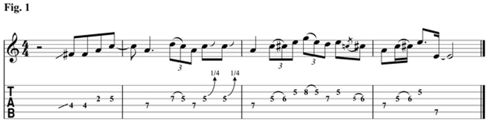 Fig. 1 is in the style of Eric Clapton, but I think you’ll be able to hear a little Freddie King in this lick as well. King was a big influence on Clapton’s playing—check out “Hideaway” from the John Mayall and the Bluesbreakers Featuring Eric Clapton album. One idea that has worked its way down the blues family tree is combining both major and minor pentatonic scales.