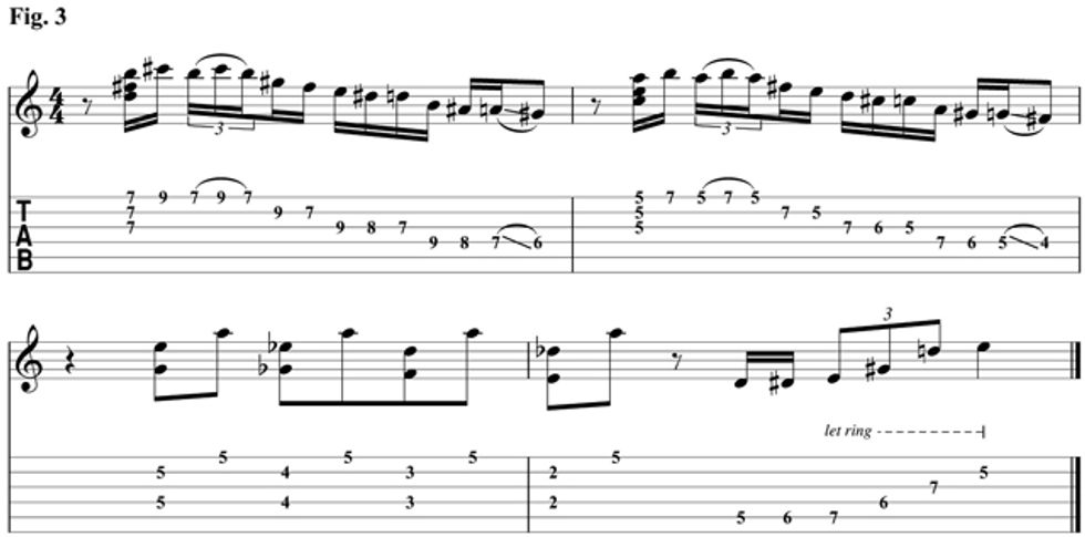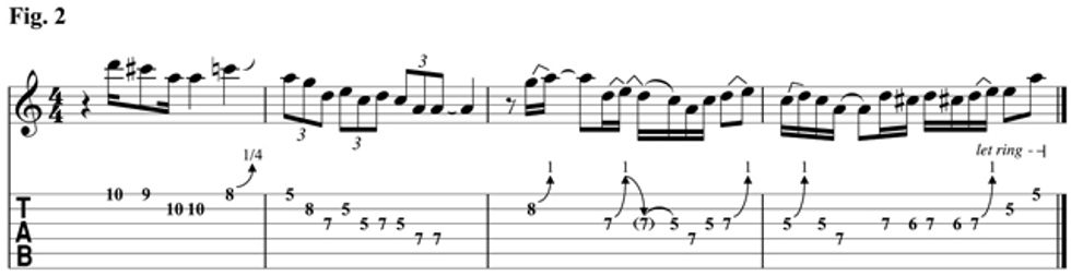 For Fig. 2 we move on to the style of B.B. King and check out what he might play over a slow blues. Similar to the previous example, we also hit on the C# in the first measure to establish the tonality, but in a different way. Here, we are thinking of it as a 13th of the V chord. It goes by pretty fast but still has a major impact on the overall vibe of the lick. A simple, but effective element of the lick happens in the second measure. Over the IV chord (D7) King uses a descending sequence with the notes of the A minor pentatonic scale. The final two measures are based in fifth position with a return to using the 13th in the last measure.