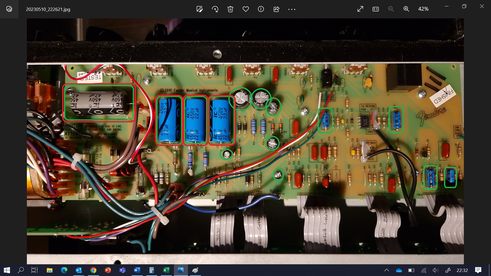 Note the 14 circled electrolytic capacitors in this photo. Filter cap replacement kits are affordable and widely available online.