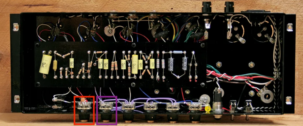 The simplicity of this Komet K29's point-to-point-wired preamp makes it easy to see the methods used to voice its two gain stages, which employ both halves of a single 12AX7 preamp tube (not shown, but mounted on the underside of the chassis, beneath the two highlighted orange capacitors). Two sets of cathode-bias resistors and bypass capacitors (Box 1) help establish the core voice of each stage, while two .022µF coupling capacitors (Box 2)—one between each gain stage and the level control that follows it—further refine the frequency response.