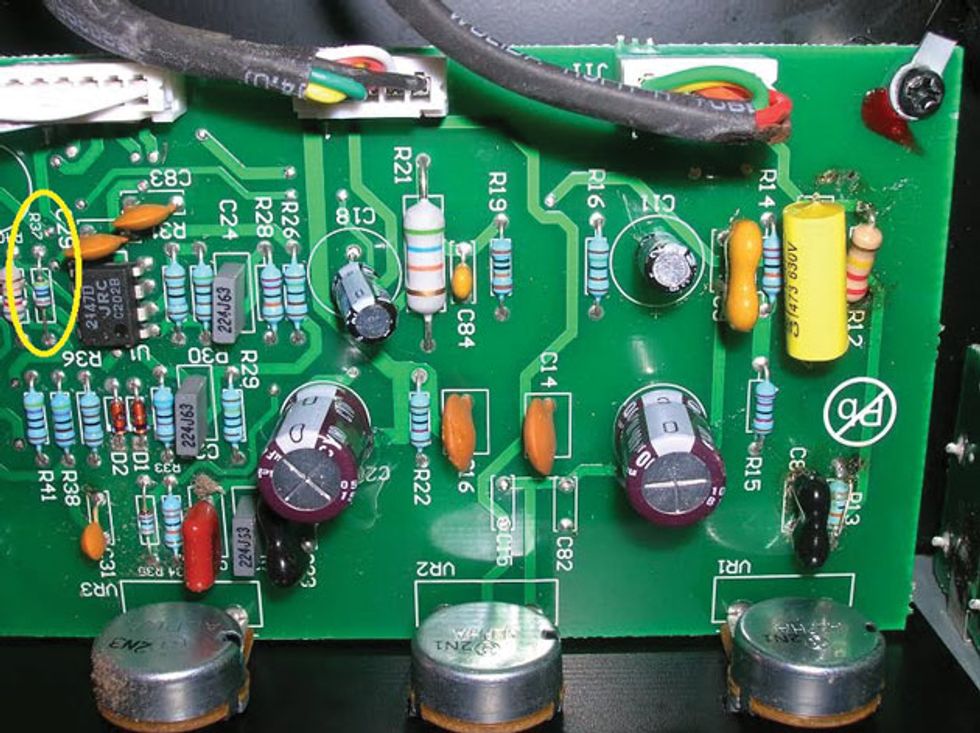 Fig. 1 — Start by lifting the side of the R37 resistor not connected to the amp's integrated circuit and attaching a new wire to it. This wire will connect to one of the common terminals of the DPDT switch.