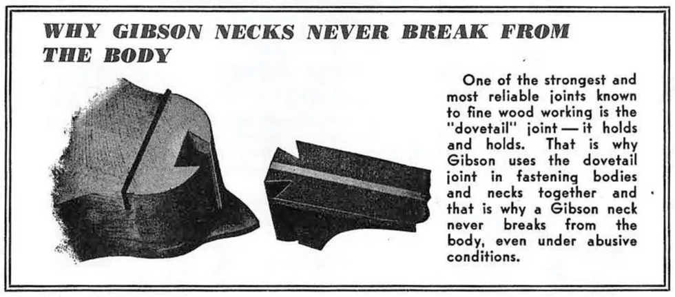 Neck joints. Historically, the two methods used to attach the neck to the body are the dovetail joint (Fig. 7) and mortise-and-tenon joint (Fig. 8). Traditionally bonded with heated hide glue, both joints are designed to be strong and permanent. In fact, in an early ad, Gibson proclaimed its dovetail joint "unbreakable" (Fig. 9).