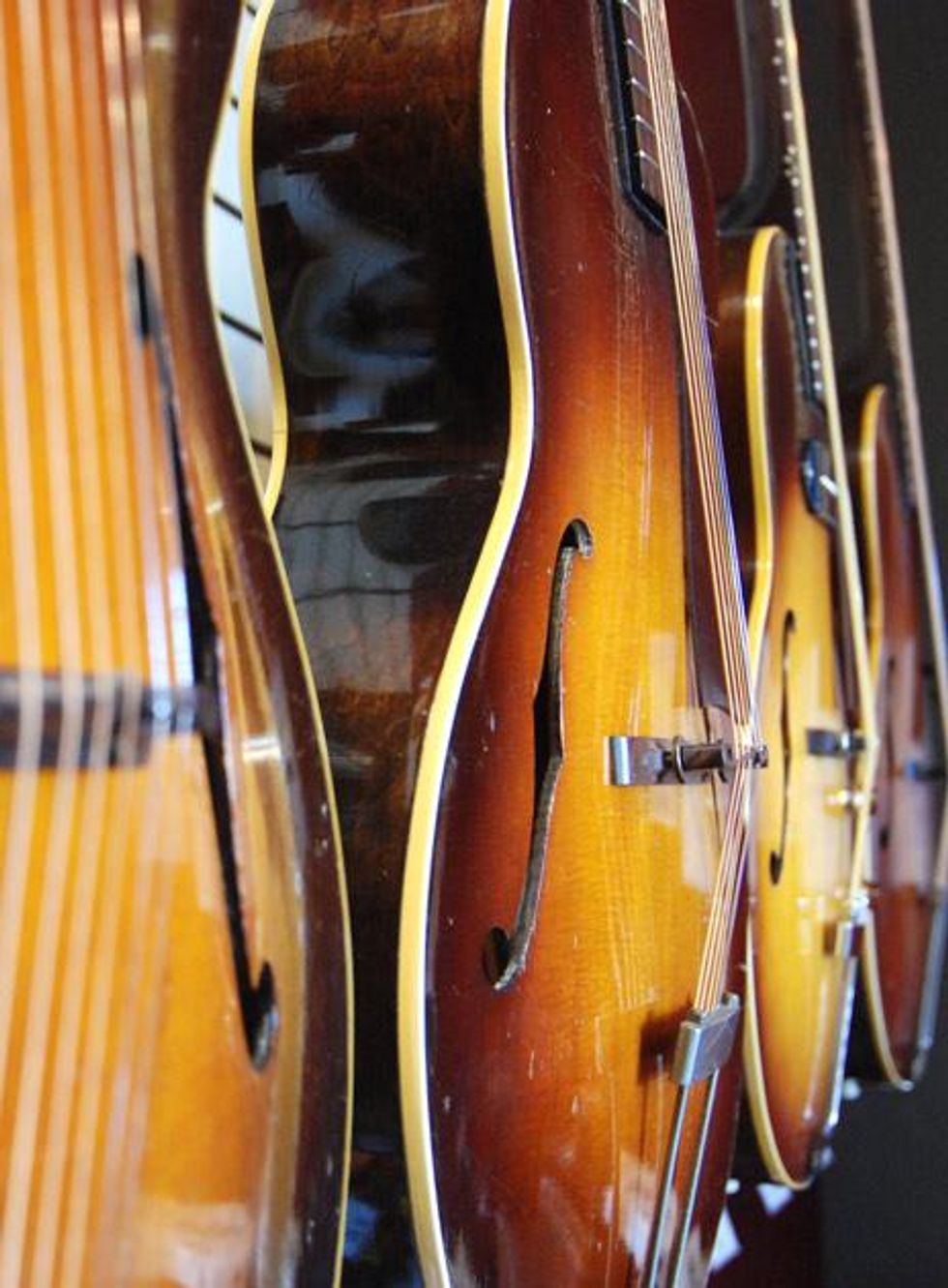 When viewed from the side, the string path of a properly set up Jazzmaster (Photo 1) is reminiscent of an archtop, such as a venerable L-5 or ES-175 (Photo 2). The strings flow from the tailpiece and break over the floating bridge at an angle, then plummet down a pitched-back neck toward the nut and tuning machines. In theory, the downward force exerted on the bridge keeps the strings in place while the bridge freely rocks back and forth with vibrato use.
