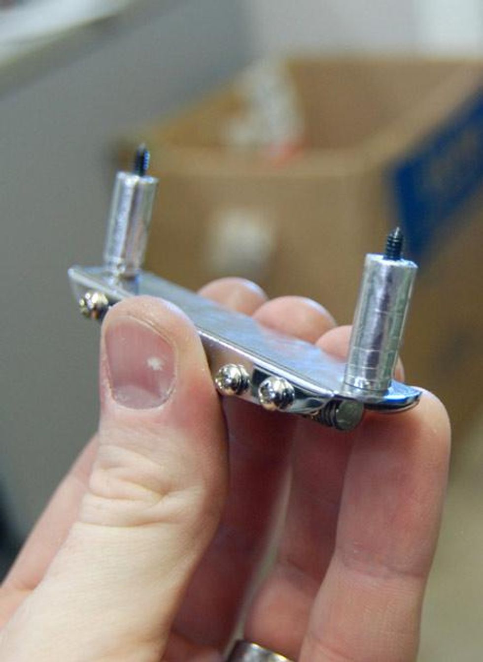 The two best ways I've found to address this are as follows. First, soldering the finish wraps of the strings reinforces them more than enough to withstand even heavy vibrato use. Or, if you're handy, flip the screws over. Simply remove the vibrato from the body, unscrew the spring and claw assembly, and set aside the anchor plate. Remove the offending outermost screws, re-insert them upside down, tighten them down, and then reassemble the entire unit as standard. With the heads hidden, the threaded ends of the screws will barely poke out of the body plate (Photo 11), leaving more than enough space for strings.
