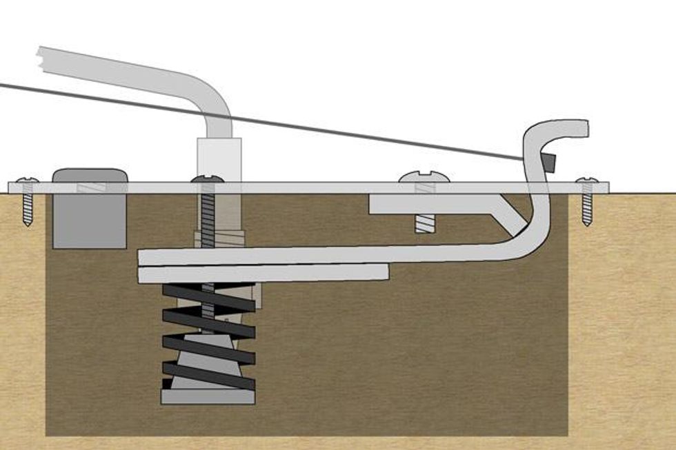 Another option is adding a Buzz Stop—an aftermarket part that bolts onto the vibrato plate and forces the strings down toward the body. This isn't my favorite solution, because it not only shoves the strings into the back of the bridge, it also introduces another point of friction between the vibrato and bridge, and this can upset the feel and stability of the system.