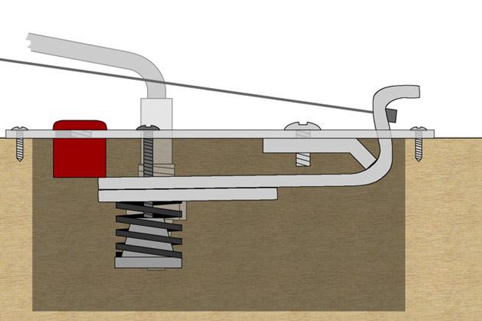 This assembly hinges on a pivot plate, which is attached to the face of the unit by three screws. When the bar is depressed, this pushes the anchor plate down toward the spring, which, in turn, pushes back (Fig. 1).