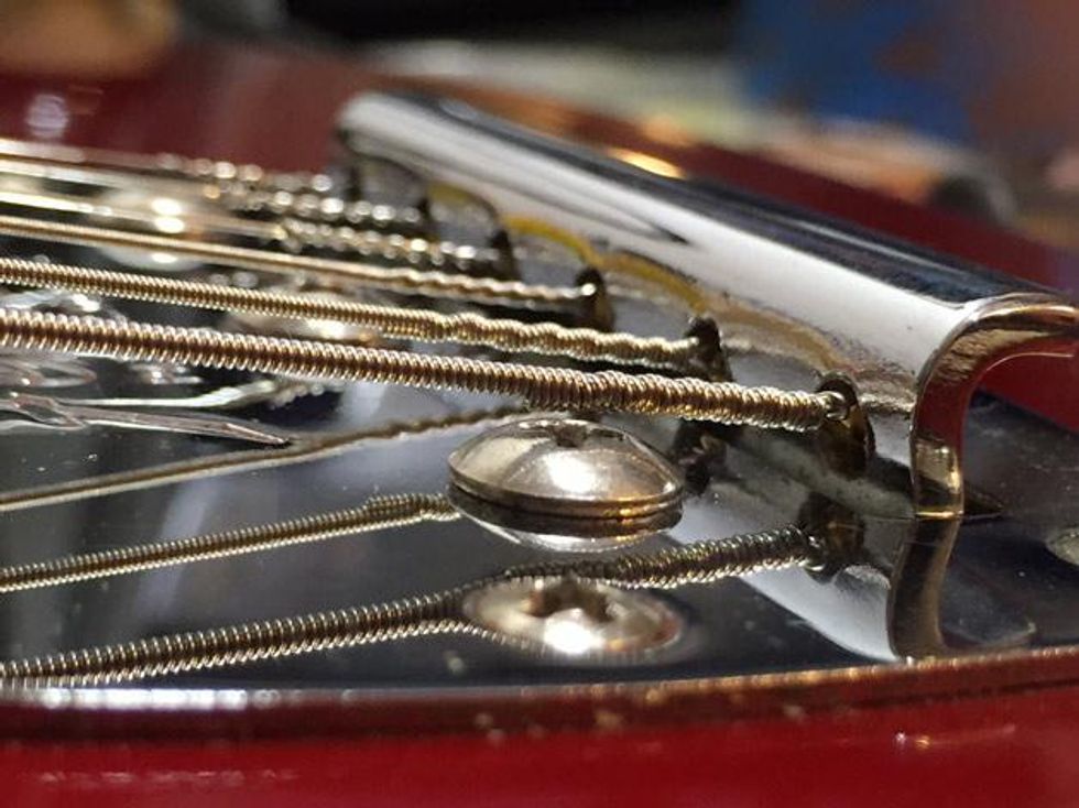 The other main source of frustration when it comes to string longevity is due to the E strings not having enough clearance over the outermost screws that secure the pivot plate. On vintage trems, these screws have a flattened dome and aren't an issue, but for some reason the American Vintage reissue vibratos have taller, fully domed screws, which causes big problems for the low E string (Photo 10). As the player uses the vibrato, the string rubs against the Phillips head of the screw, which eventually saws through the finish wrap of the string, causing it to unwind.
