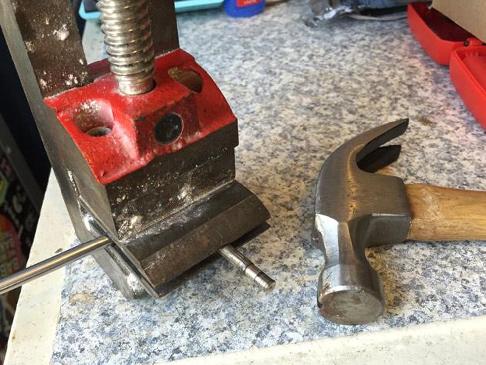 Put the arm in a vice and clamp it down with about 1" of the insert end sticking out (Photo 12). One good tap on that end with a hammer will put a nearly imperceptible bend in the end of the arm, and that's just enough to create some positive contact. Repeat a few more times if it's still not quite right or you want your arm to stay in place when you let go. This is legitimately one of my favorite and most-used tricks.