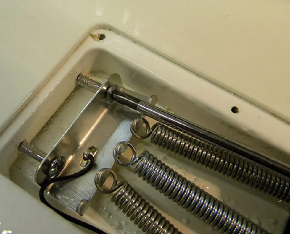 Fig. 3: Adjusting the trem claw to bring the bridge base level with the guitar body.