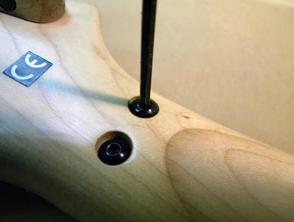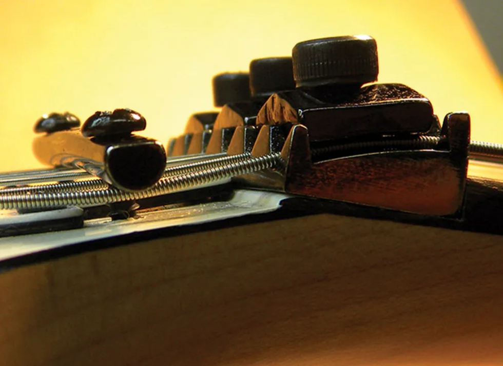 Take great care when you tighten the string blocks at the nut. If you overtighten them, it will ruin the blocks and you might strip the bolts. The blocks just need to be snug. When grooves appear in the blocks, it's time to replace them. Otherwise, the blocks won't lock down the strings and can cause them to break.