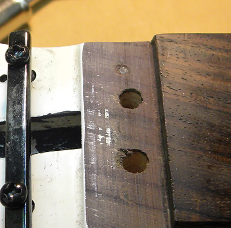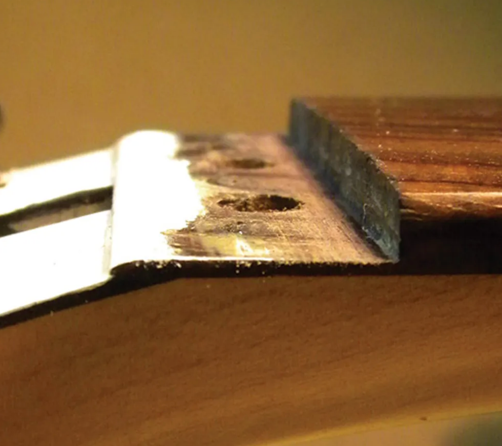 Instead of shims under the locking nut, I found a big glob of paint (Fig. 7). This raised the locking nut, so it had to be removed. When a locking nut is jacked up too high, the best way to deal with the problem is to measure the depth of the rosewood slab that's under the locking nut to determine if you can remove any wood without compromising the structural integrity of the neck.