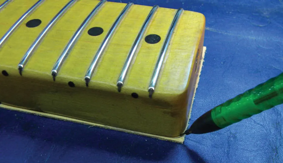 Fig. 10. Checking the bottom of the shim to confirm that the end facing the headstock is sanded a bit thinner than the end facing the bridge. The pencil marks tell the story.