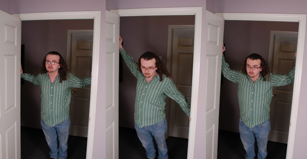 - Raise your right hand up about a foot on the door frame, and lower your left hand about a foot.
