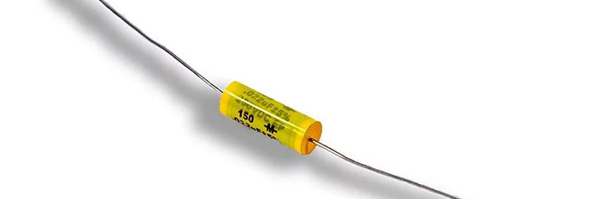 Mallory caps have a tubular shape and yellow color. You can find these caps in a lot of amps, and also inside guitars as tone caps. These caps have a great fat and punchy sound, pronouncing the mid frequencies while keeping the treble alive. This is the ideal tone cap for rock guys, and a lot of our customers choose them for their Les Pauls and SGs. They also sound great inside Fender guitars, and Leo Fender put these caps inside all of his "Music Man" amps, manufactured exclusively for him by the Plessi company. This is a good overall tone cap, and a great place to start; it seems to work well with both humbuckers and single coils. You can buy these caps new from a lot of companies.