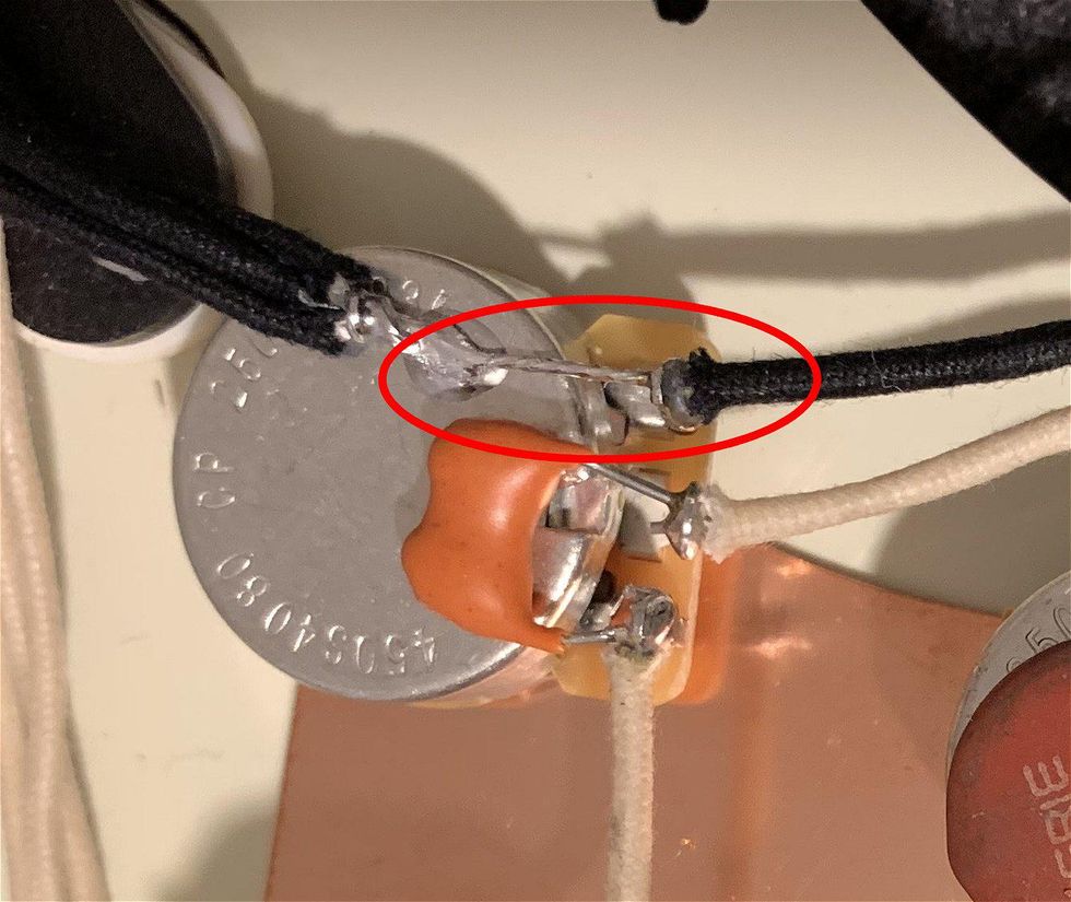 Let's assume you managed to bend the lug towards the case without breaking it. You'll need a really hot soldering iron to connect both parts with each other, and soldering time will be a little bit longer than usual. The chance of overheating the pot is something to consider. With a good and quick soldering technique that comes with experience and the right tools, it's doable, but avoiding overheating is important to not kill your pot. If you're working on a vintage guitar, be very careful to not break the lug while bending it. Take care to clean both contact points and use a heatsink wherever possible. For more tips about soldering to pots, please read this column I wrote last year: "How to Install and Maintain Your Guitar's Pots."
