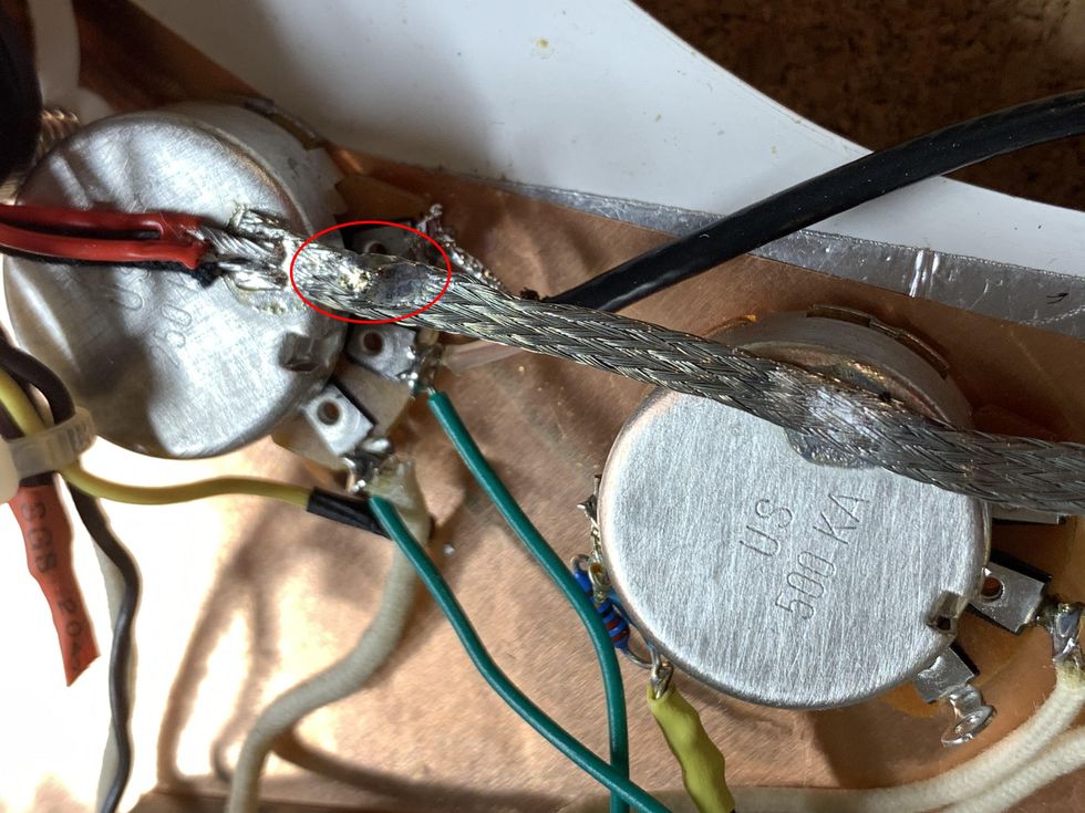 The handle of the cage is used to connect all three ground wires from the pickups individually, so it's easy to remove only one when you need to without adding any more heat to the case.