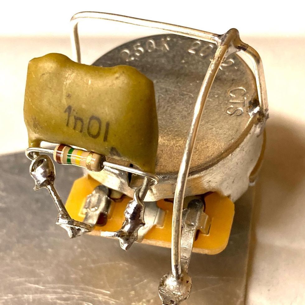 To resume from the first part, please remember that the goal is to connect an individual part or piece in the circuit to ground, and the quality of a ground connection inside a passive circuit is not dominated by the gauge of the wire that's used. So, the more the merrier may look cool, but it's simply not necessary to overdo it here. Personally, I use a silver-plated, solid core AWG24 copper wire that looks nice and shiny and is also a joy to work with.
