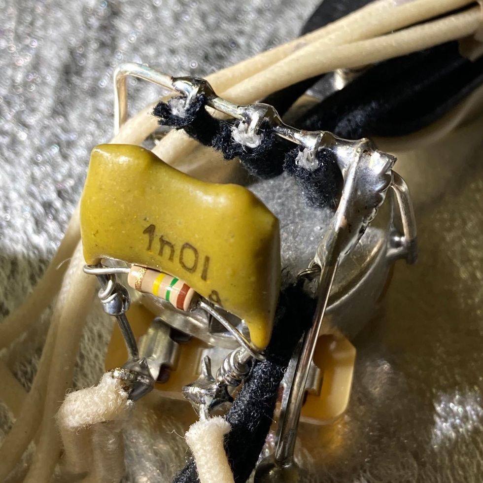 The handle of the cage is used to connect all three ground wires from the pickups individually, so it's easy to remove only one when you need to without adding any more heat to the case (Photo 8). It's also the perfect connection point for any other ground wires in the circuit, like the ground wire from the output jack, the string grounding wire coming from the tremolo claw, etc. And it's also a great guide for the hot wires from the pickups on their way to the pickup selector switch, so you don't need to use any additional tape, cable ties, or whatever else to bundle the wires. Is that a cool and clever solution, or what?