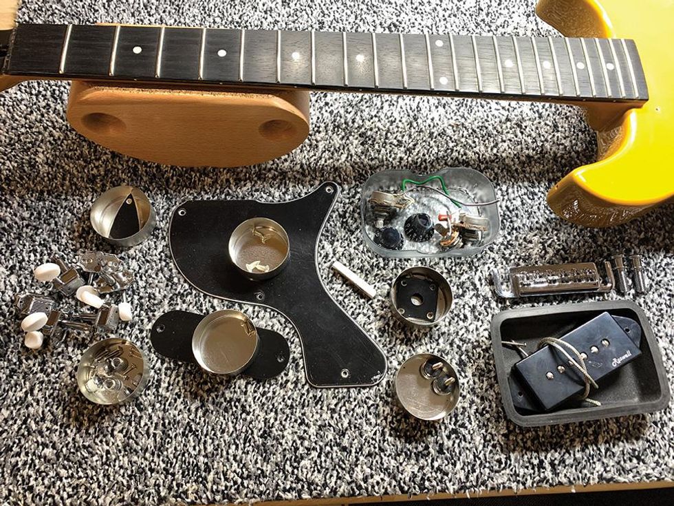 The first step is to completely disassemble your guitar, as I did, which you can see in Image 3. It's helpful to separate and label all small parts so you don't have any difficulties putting them back together. Take photos of the whole guitar and the details before you take it apart, and get some small containers (empty cans, boxes, cups, or whatever) to store all parts during the project. Store the screws together with the corresponding hardware, i.e. the screws from the pickguard taped on the back of it ... you get the idea. Also, as the proud owner of several cats and a dog, I speak from experience when I highly recommend using containers with a lid so you can close them, at least when your furry buddies have access to your working space.