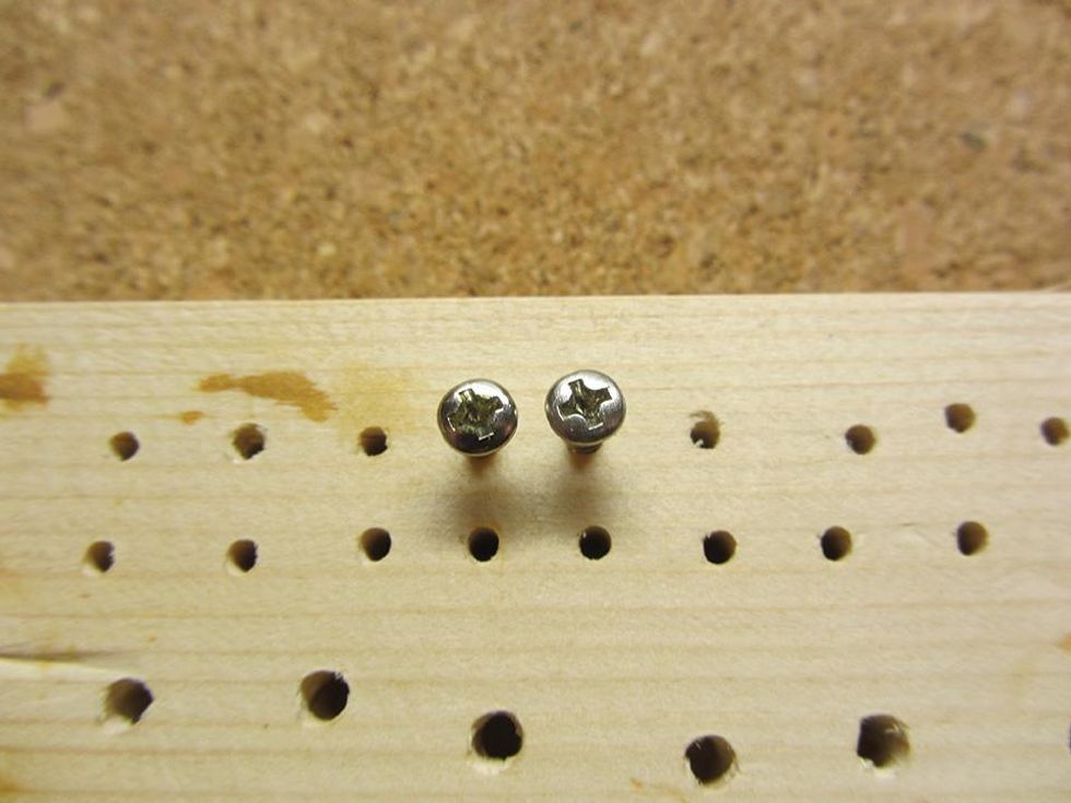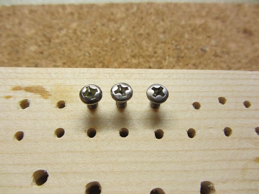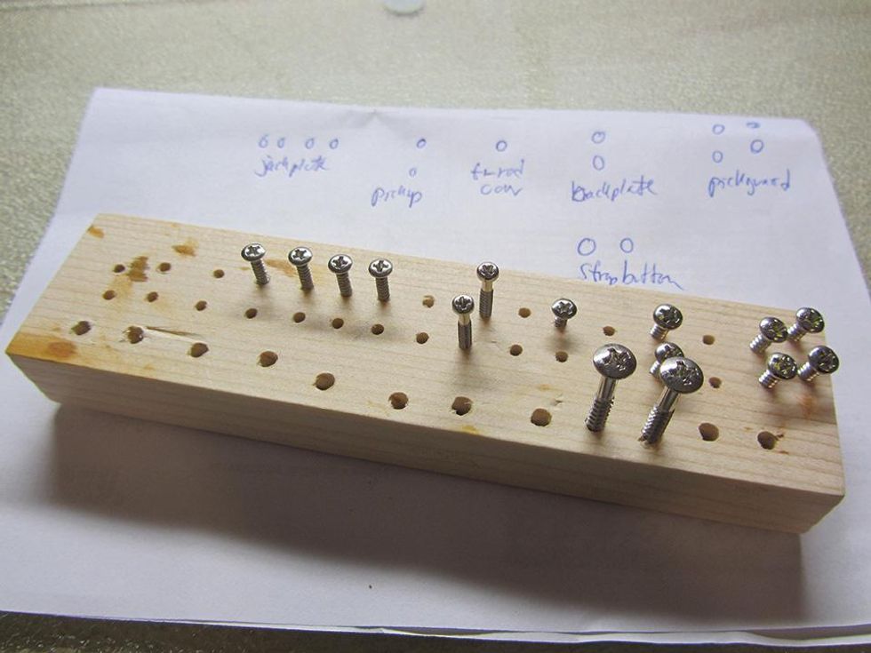 Take a piece of soft wood and screw in all of the screws with a screwdriver that matches the head type and size on your screws (Image 5). You don't need to screw them all the way in—just until they can't move or tip over. To keep the overview, arrange them in groups and make a kind of roadmap of what goes where. This way you won't mistake any of the screws as you reassemble the guitar.