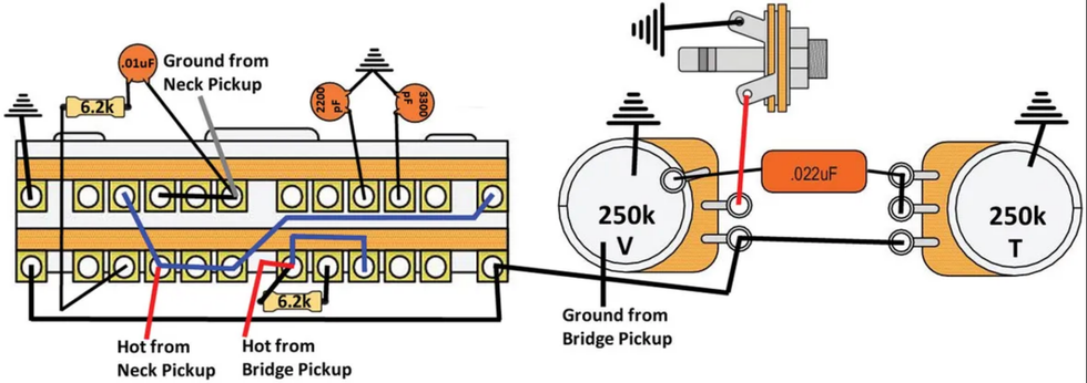 If you're a Mod Garage regular, you'll spot familiar themes in this circuit because we've investigated these tricks before—namely, adding caps in-line with a pickup ["The Stratocaster 'Jazz Switch' Mod," November 2011] and half out-of-phase wiring ["The Bill Lawrence 5-way Telecaster Circuit," October 2015]. But here's the twist: Now everything comes together in one wiring!
