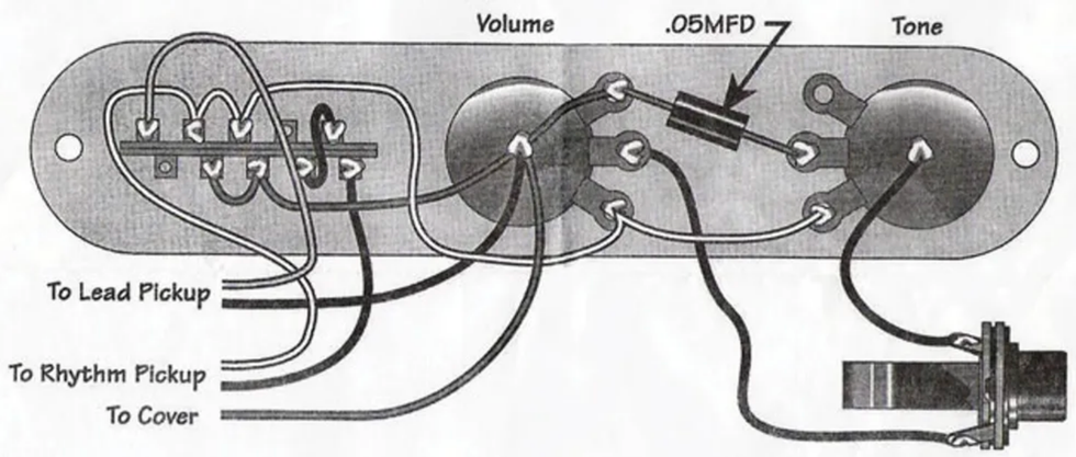 Naturally, this arrangement works with any two-pickup guitar, not just Telecasters. The wiring shown in Fig. 2 employs a push-pull pot with a 2PDT switch, but you can also use a DPDT mini-toggle on the control plate—just move the relevant wires to the new switch. Please keep in mind, though, that you must convert your neck pickup to three-conductor wiring as mentioned above, assuming it has a metal cover connected to common ground.