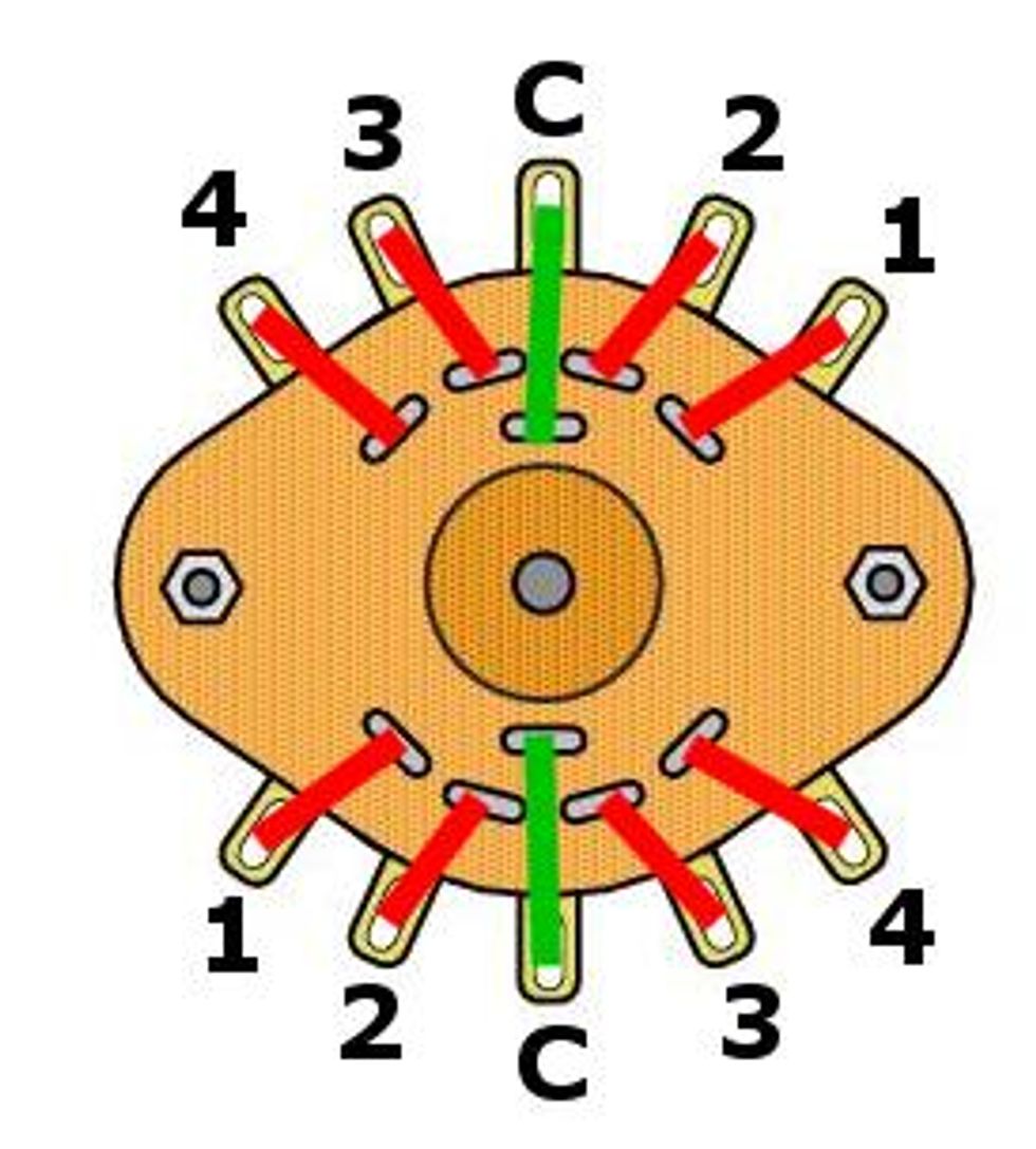 For this you need a 2P4T rotary switch, which means it has two poles (comparable to the standard 5- and 3-way switches you all know) and four switching positions. Physically you have five lugs on each switching stage, with one of them being the output of this stage. The lugs are numbered from 1 to 4 and the output on a rotary switch is always labelled with a “C” for “common.” The rotary switch wiring you need is illustrated in Fig. 1.