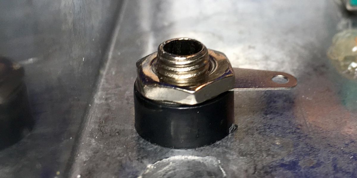 As for the banana posts, they have a hollow, threaded column with an insert at the top that accepts a banana plug. IMPORTANT: You don't want that metal post touching the metal enclosure at all. Thankfully, banana posts come with plastic insulators that go around the post, ensuring that they don't short-out the circuit. Install the banana post from the top, as shown below.