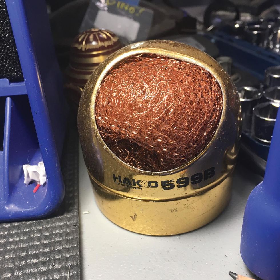 Something to clean your iron. This is something you should be doing quite frequently! A moistened sponge works, while something like the handy Hakko 599B Tip Cleaner helps prevent solder blobs from flying in your face or hair.