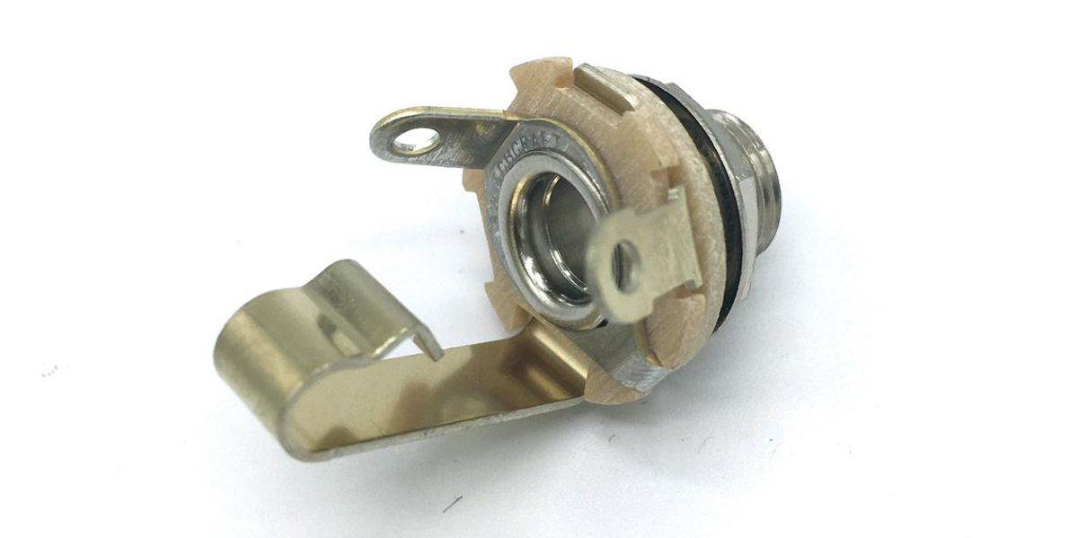 TECH TALK: Let's discuss 1/4" jack anatomy for a second. We are using two types—our output jack is mono and has two tabs, while our input jack is stereo and has three tabs. Turn the input jack sideways, and you'll see three protective wafer layers separating three metal terminals on the jack. These are commonly referred to as the "tip" and "ring." The ring is above the second wafer. The tip is the terminal above the first wafer, just above the base of the jack itself. The ground tab, or sleeve, is connected to the center part of the jack at the base, floating above all three wafers, and does not have a protective wafer on top. The output jack will only have two protective wafers separating the two metal conductors (the ground and tip tabs). If you decide not to add the battery snap internally, you could use two mono Switchcraft jacks as you would not need the additional ring connection used for turning the battery on and off.