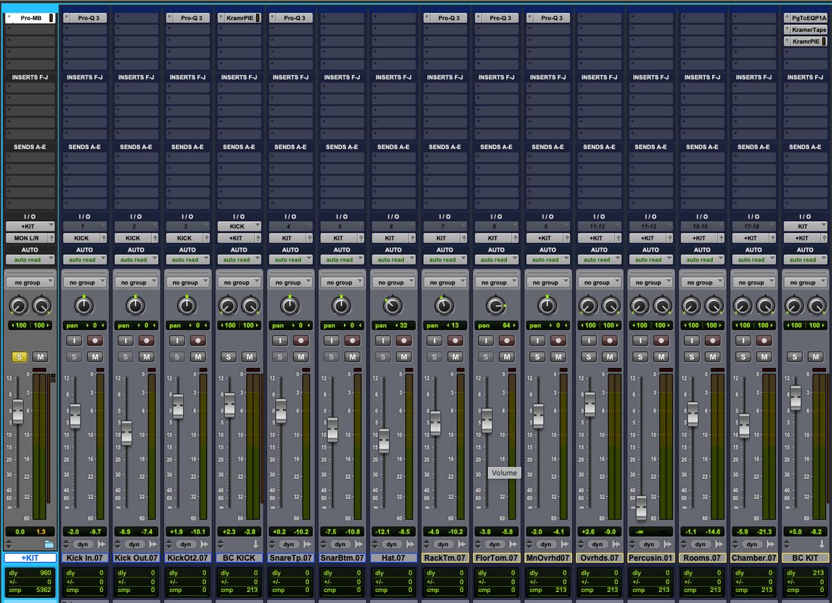 Have a look a Fig. 1. These are the drum tracks I recorded at Blackbird, the Nashville studio where I work. I've got the three kick mics routed to BC KICK (five slots from left), then routed to +KIT (the light blue slot, far left). The rest of the 10 drum tracks are routed to BC KIT and then to +KIT to merge with the kick drum tracks mentioned before. I do this because I like to process the kick drum independent from the other parts of the drum kit. Low-end information (kick drums, bass, low-tuned guitars, bass synths, etc.) are full of energy and trigger compressors to overreact at the expense of high frequencies. Once all the drums are merged together in +KIT, I use the FabFilter MB multiband compressor.