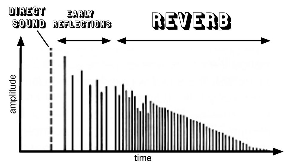 First, let's look at the main parameters of reverb. In any given space (size doesn't matter), something has to happen that sets sound pressure waves in motion. This is called an impulse function (a loud clap, popping a balloon, a righteous, single, 100-watt djent, etc.). The measurement of that impulse function is called the impulse response (IR). The impulse response contains four main parameters of what we generally call reverb.