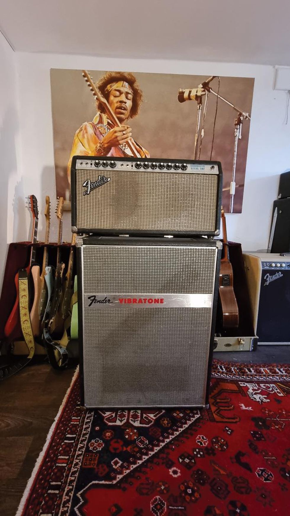 It's time to discuss the Fender Vibratone—Fender's "Leslie" guitar speaker. The Leslie cabinet is famously known for making the swirling sound of the Hammond organ, which everyone has heard in classic soul, gospel, and blues recordings. But the Leslie is also great for guitars. I try to be a natural-tone idealist, eschewing most effects, but Leslie-style modulation is my guilty pleasure.